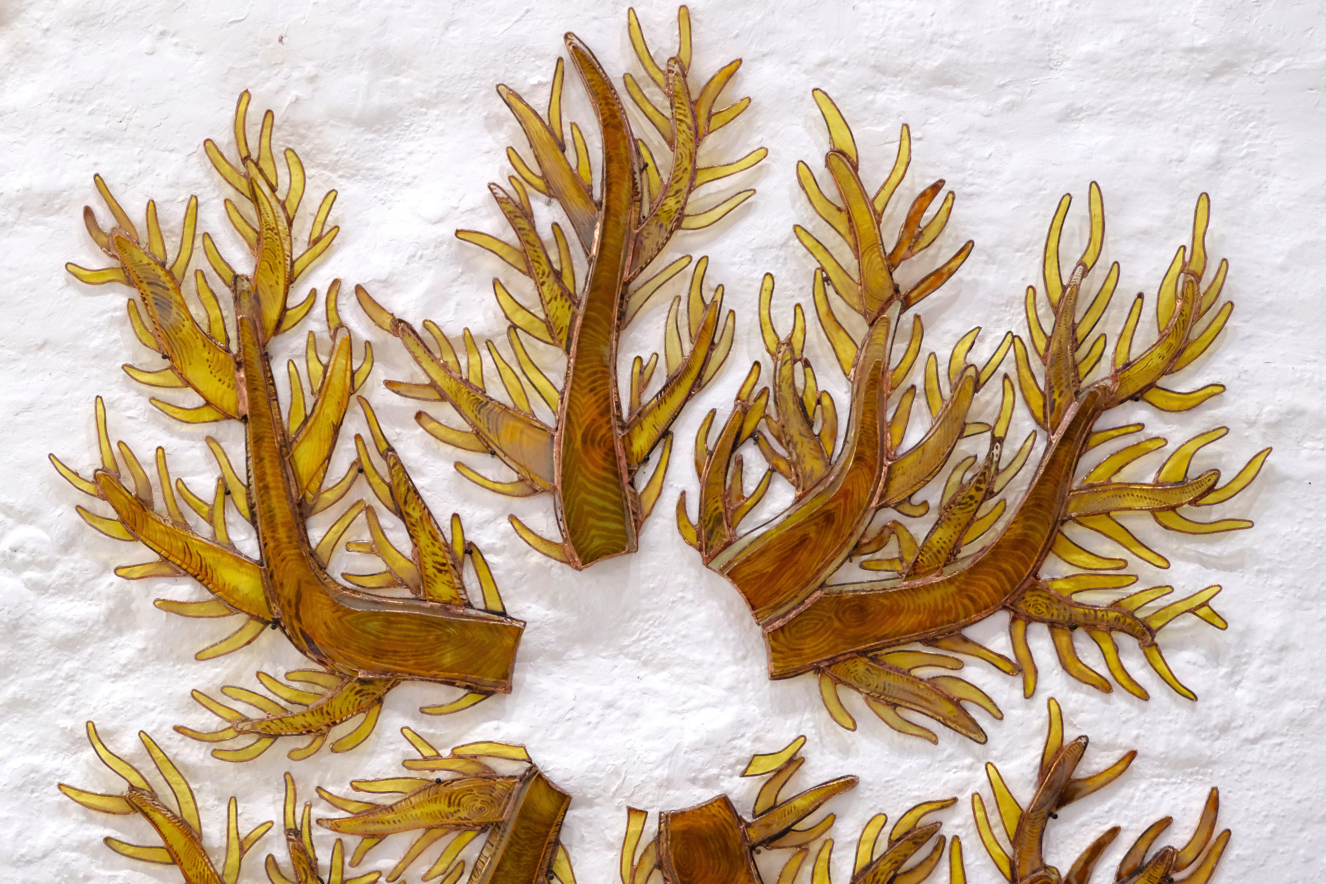 Bois de prunier, verre trempé, verre dessiné au jaune d’argent, cuivre, étain