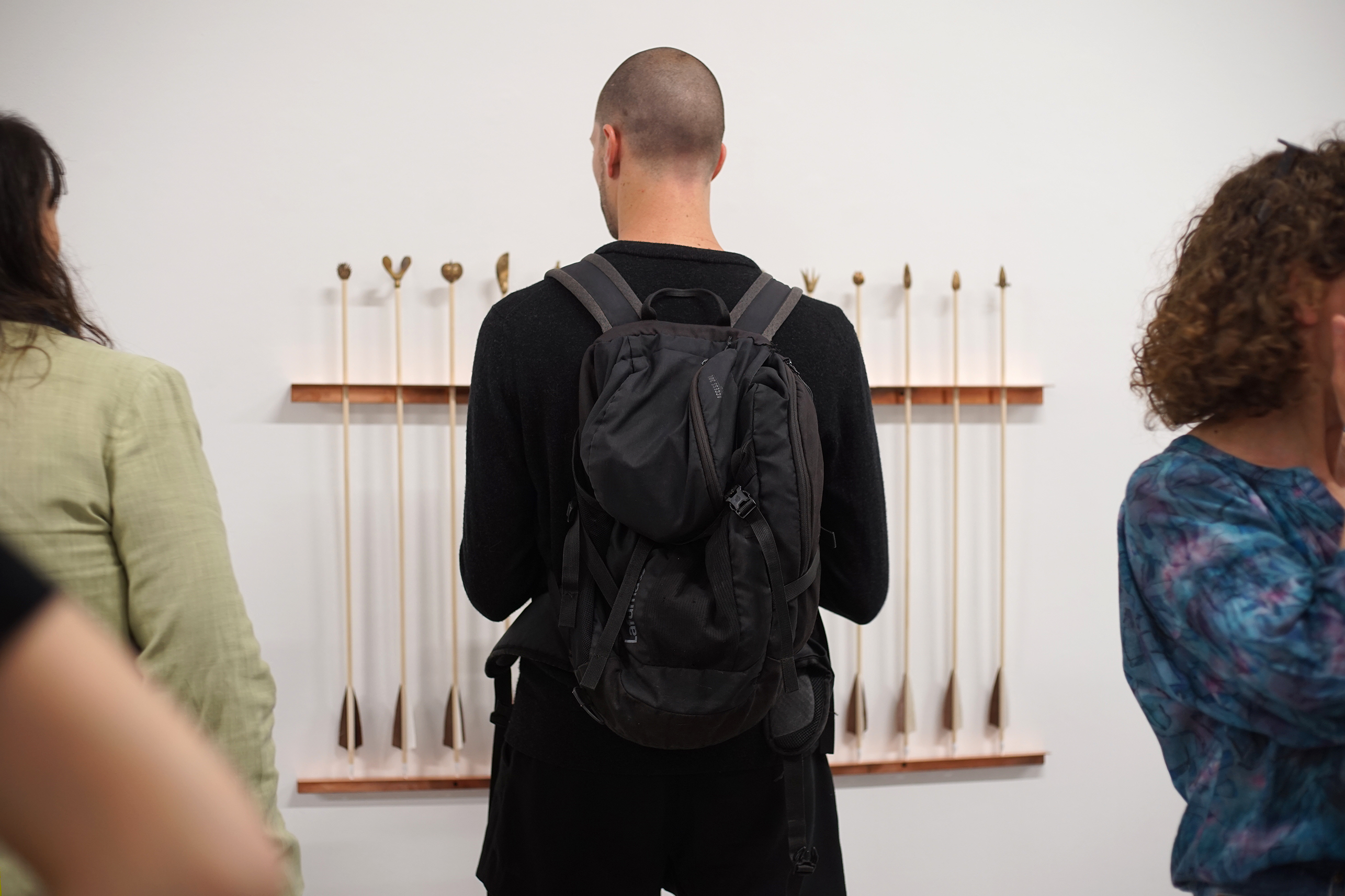Performance pour 14 pointes en bronze montées sur tube de bois, plumes d’oie,76x5cm chaque.