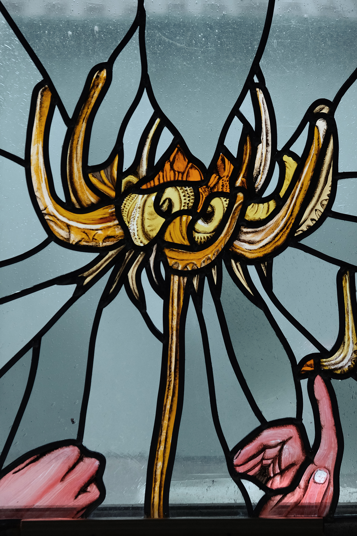 Various color blown glass, grisaille and enamel, lead and tin.