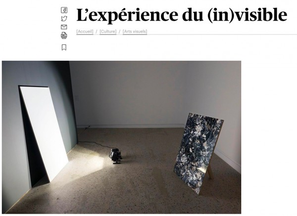 L’expérience de Le masque et le miroir de Julien Discrit est symptomatique de l’effet de l’exposition sur le regardeur, que Moeder désigne dans le texte d’introduction comme une « frustration latente ». Cherchant à discerner un mot imprimé sur papier et encadré sous verre dépoli, on se voit forcé d’effectuer un va-et-vient constant avec l’objet afin d’y tenter une lecture. L’exposition invite sans cesse au mouvement : mouvement de l’œil qui balaie la surface des œuvres à la recherche d’indices, mais également mouvement du corps qui fait se dévoiler certaines des œuvres de l’exposition. Dans Ashes, Claire Hannicq fait littéralement renaître l’image de ses cendres par le mouvement. Un rectangle blanc de contreplaqué, appuyé contre un mur et fortement éclairé, vient se refléter dans un tirage photographique sous verre montrant des cendres, placé juste devant la forme rectangulaire. Par son déplacement dans l’espace, le regardeur contrôle l’apparition spectrale de l’image.